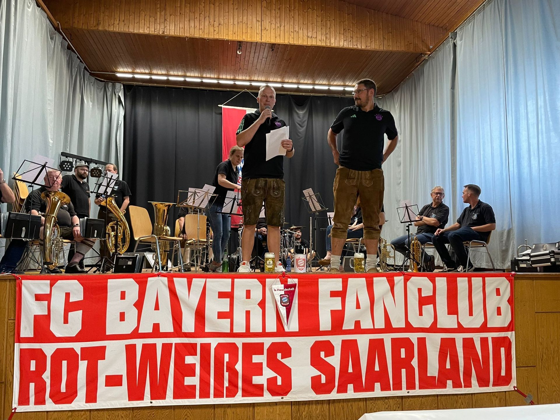 Heiligenwald/Schiffweiler. Es gab Grund zum Feiern. Am 03.09.2023 versammelten sich die Mitglieder des Bayern Fanclubs aus der Gemeinde Schiffweiler in der Jahnturnhalle in Heiligenwald, um das 10-jährige Bestehen zu feiern. Bei zünftiger Blasmusik, untermalt vom Musikverein Harmonie aus Schiffweiler, frisch gezapften Halben und bayrischen Buffet, begrüßten die Vorsitzenden Maximilian Zwick und Sebastian Beck die Gäste.